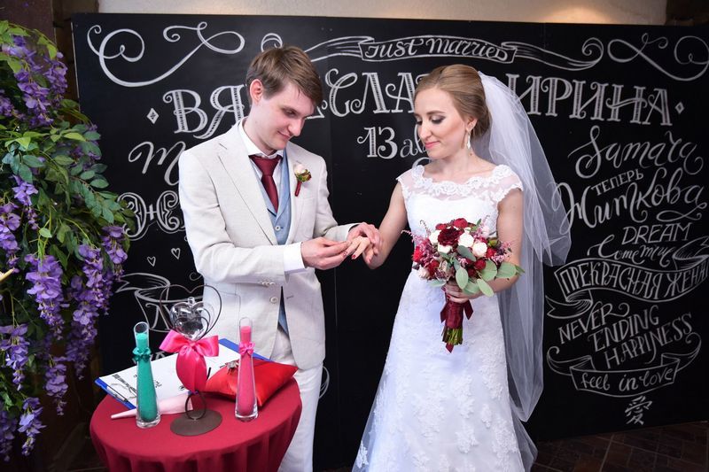 Меловую доску можно оформить вашими именами, монограммой, клятвой, датой торжества, семейным слоганом или цитатами о любви. Фотографии на фоне грифельной доски получатся стильными и необычными.